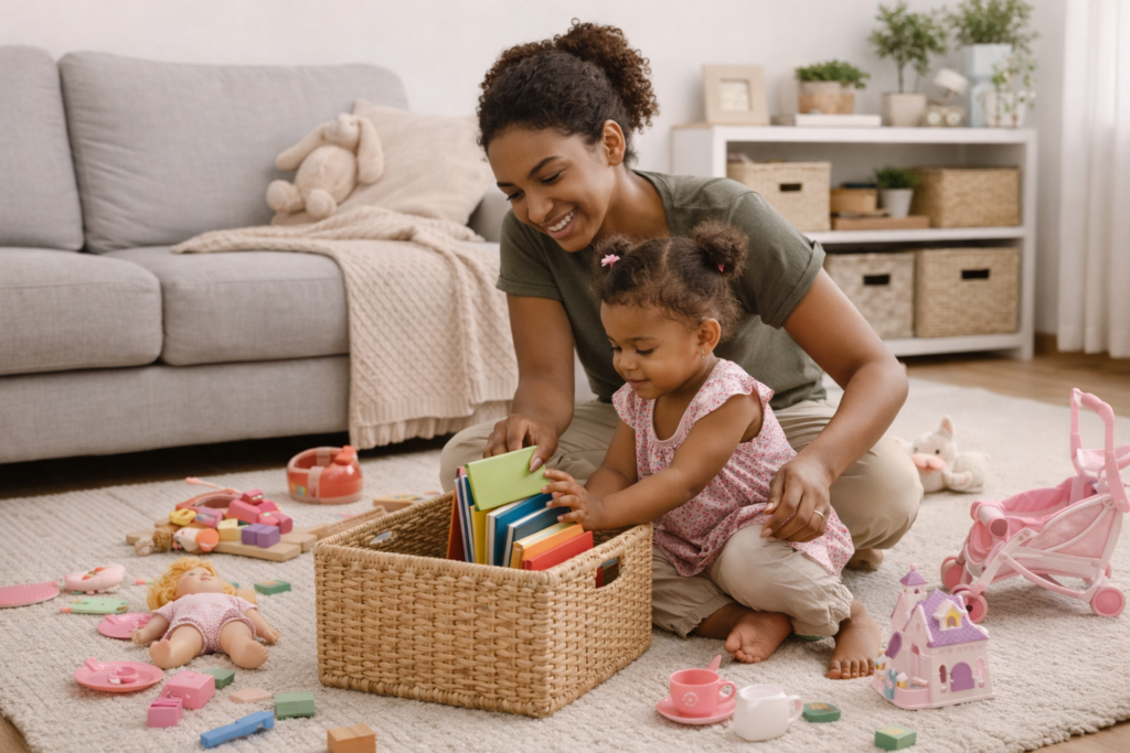 Guardar brinquedos não deve acontecer apenas quando “alguém manda”. Deve fazer parte da rotina. O ideal é uma rotina curta, diária e previsível.